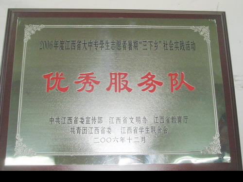 近日,我校高職學院被中共江西省委宣傳部、江西省文明辦、江西省教育廳、共青團江西省委、江西省學生聯合會授予2006年江西省大中專學生志愿者暑期三下鄉社會實踐活動“優秀服務隊”稱號。